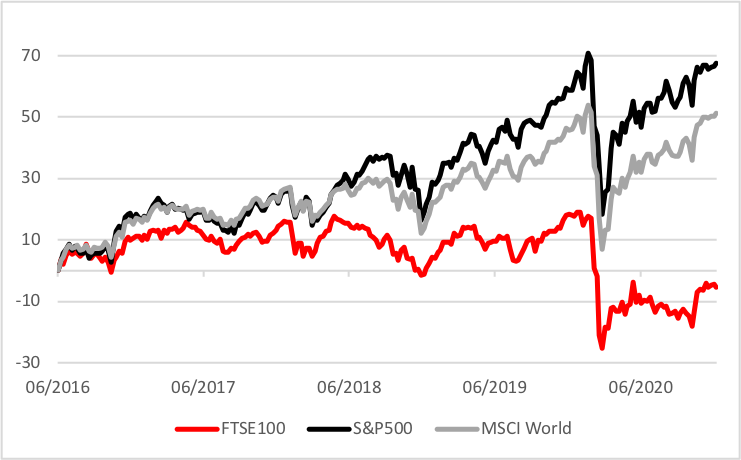 The FTSE100 has barely risen in the post Brexit referendum period. For those investing in Ireland and trading in Euro’s it has actually returned a cumulative 5.5% loss. This compares to a 67.5% gains for the US market S&P 500 and 51.2% for World market MSCI World.