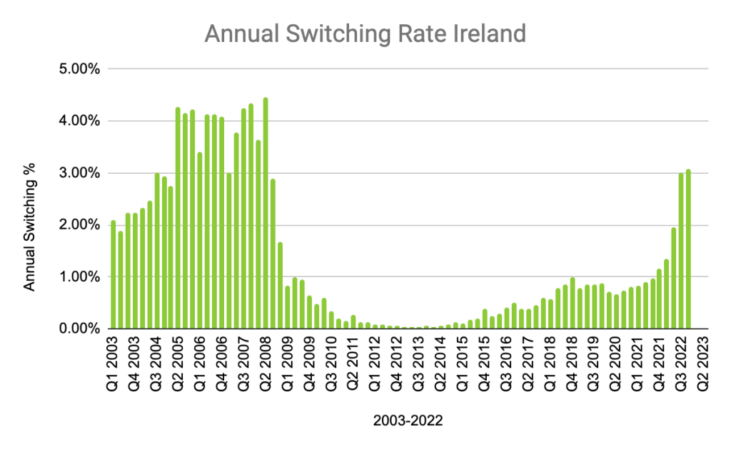 3.08% of existing mortgage holders switch per annum down from a peak of 4.27% in 2005 according to moneysherpa analysis of BPFI drawdown data.