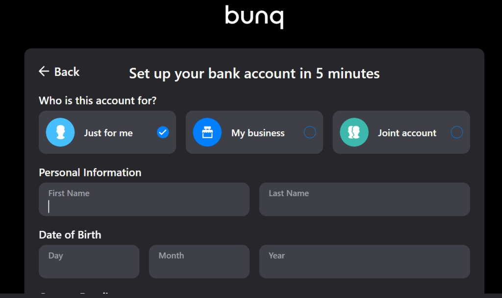 First, select which account you wish to set up. You have the option to set up rather a personal, business, or joint account. Then you need to fill in your personal details. This includes your name, date of birth, email address, home address, and phone number.